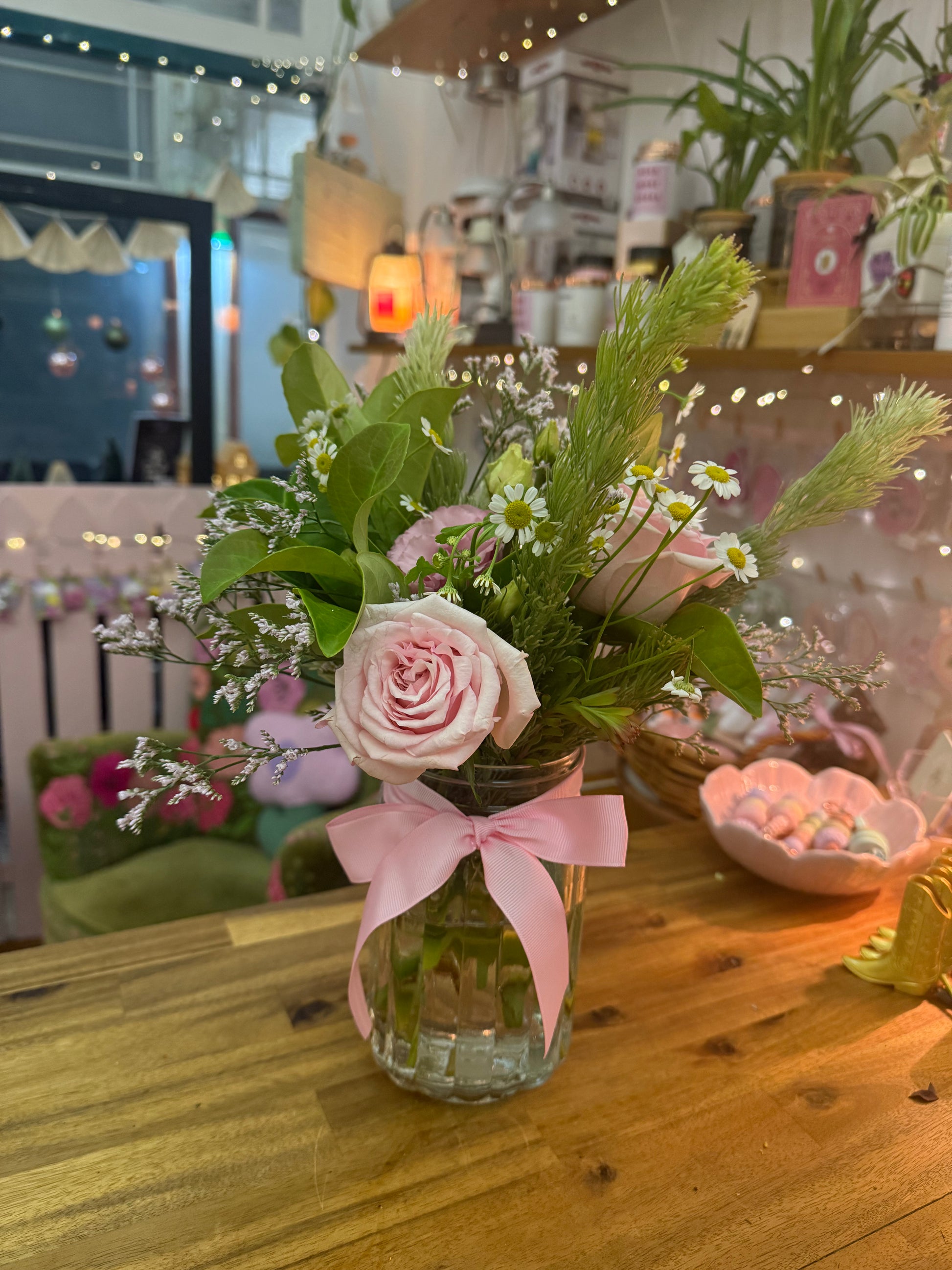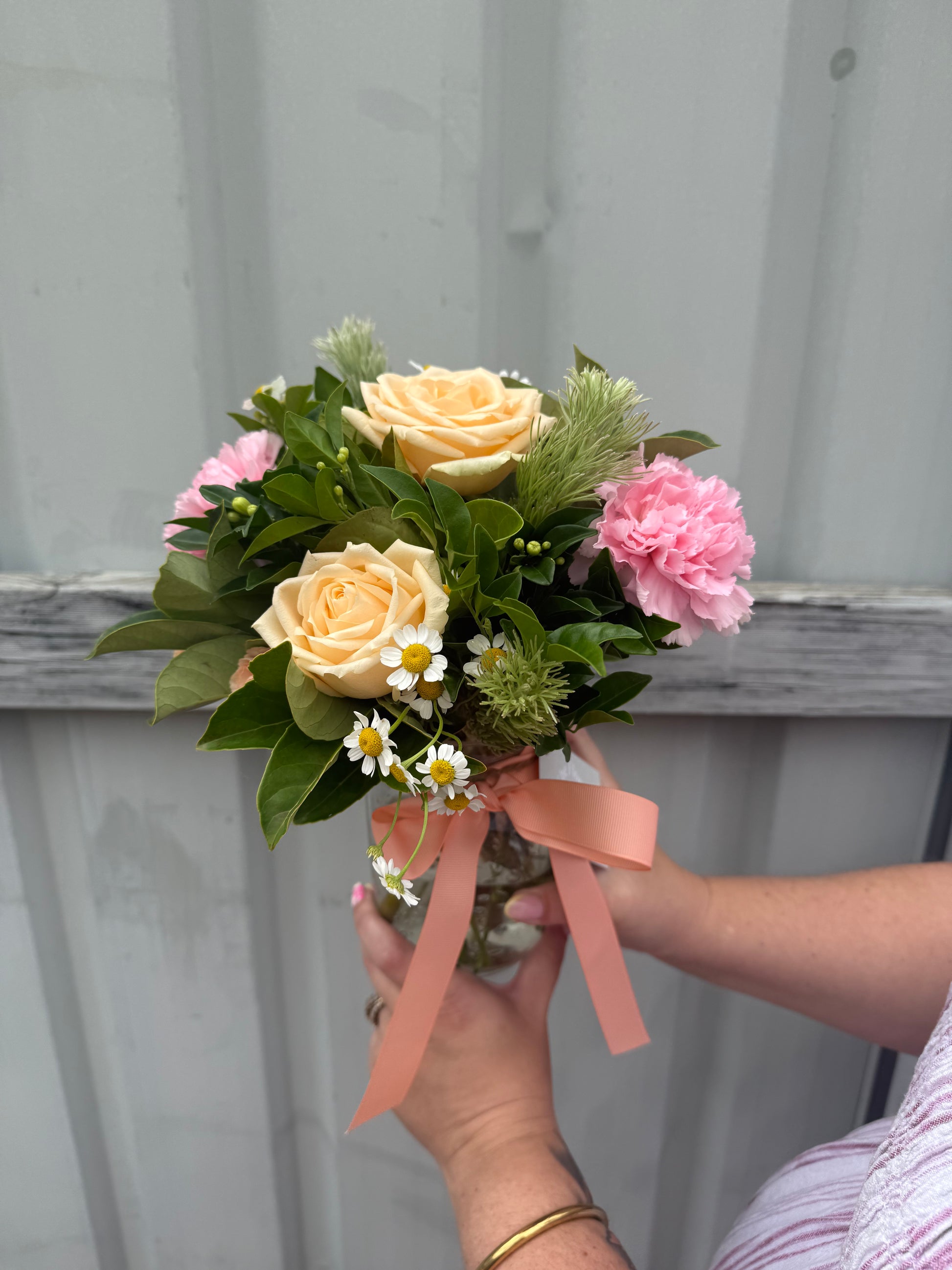 A petite collection of seasonal blooms arranged in a reusable glass jar — simple, pretty, and full of character. Think of it as the opening line to a very good day.